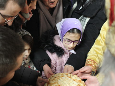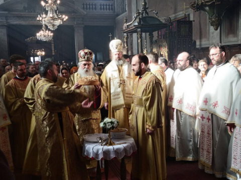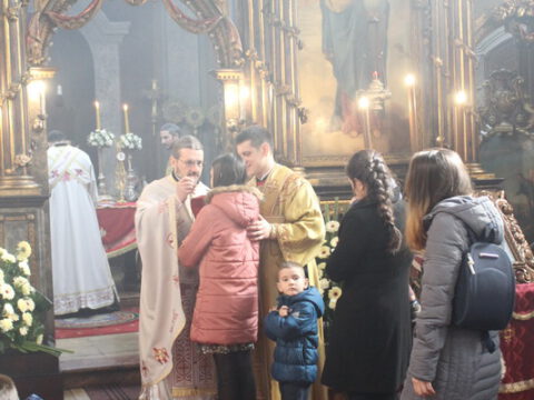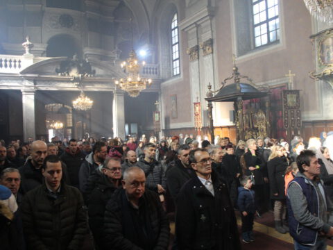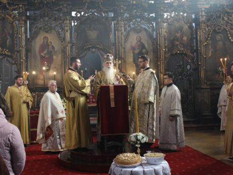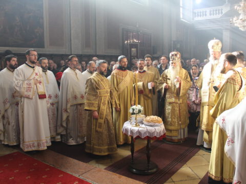 После заамвоне молитве, владика Иринеј благословио је принесене славске дарове, колач и жито.