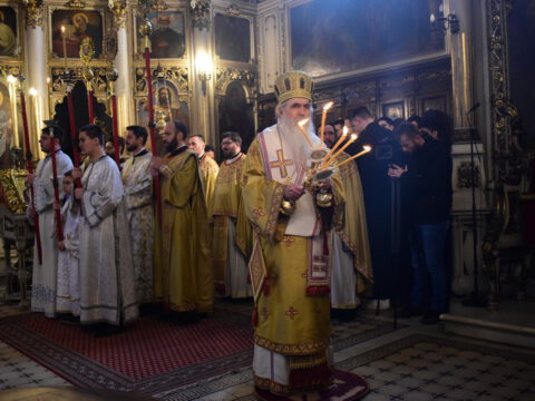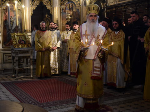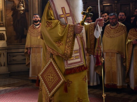 Беседећи после прочитаног јеванђелског одељка, Преосвећени владика Иринеј је указао на значај Крстопоклоне недеље и Часнога Крста Господњег. „Црква је установила да се на средини свете Четрдесетнице свечано износи Часни Крст Господњи, на наше укрепљење, на оснажење нашег подвига поста и да се њему клањамо у току ове недеље. Зато се и ова недеља назива Крстопоклоном, недељом поклоњења Крсту Господњем. Часни Крст Господњи нам пружа утеху, снагу, укрепљење и вољу да наставимо и окончамо подвиг поста којим се спремамо за Празник над празницима, за Васкрсење Христово. Данашње клањање Часном Крсту – које смо почели синоћ на бденију, и свих ових дана ове недеље – нема само обичајни, традиционални карактер, него нас уводи у саму тајну и суштину наше вере, и то, пре свега, речима Светог Писма, које на почетку овог служења увек слушамо и које онда молитвено тумачимо као вечну реч Божју, реч спасења, али коју треба да разуме сваки човек сваке епохе у складу са својим духовним потребама и са духовним изазовима те епохе. Не можемо говорити истим речима, истим примерима пре хиљаду година као што говоримо данас; ако свет буде постојао кроз хиљаду година сигурно ће исту суштину истине, исте речи Божје, проповедници у име Божје, у име Христово, у име Цркве, исказивати нешто другачијим речима, али те речи имаће исто значење, исти садржај, исти смисао који имају увек, јер је, како каже апостол Павле, Христос увек исти, јуче и данас и довека. Нема модернизације, нема прилагођавања Цркве свету и човеку. То је једно од сатанских искушења нашега времена, поред многих других, и захватило је, нажалост, велики број хришћана на Западу, али запљускује – и не треба ту бити наиван – и нашу Цркву. Имате већ многих који, не желећи или немајући снаге да себе преображавају, да носе крст, по речи Христовој, труде се да тако прилагоде Цркву и њено Јеванђеље себи, да буде – како бисмо данас рекли – сварљива за палог човека огрезлог у својим страстима и свом себељубљу и самољубљу. Стога, треба да озбиљно схватимо овај зов Божји, да се одричемо старога себе, да се трудимо да га победимо у себи, да у нашем животу, уместо страха, уместо разних других страсти, завлада љубав која је изнад свих закона и зато је врховни закон нашега бића и постојања. Како нам каже апостол Павле на једном месту, наш живот протиче тако што нас угрожавају споља борбе и напади, а изнутра наша страховања. Тим борбама ми можемо, уз помоћ Божју и светих Његових, понајпре Пресвете Богородице, да одагнамо из себе свако страховање и да победимо у свакој духовној борби, јер победу не обезбеђујемо ми; њу је једном заувек Христос Господ обезбедио управо Својим Крстом и Васкрсењем из мртвих. Зато знак крста није само знак сећања на Христово страдање него је реални знак спасења, носилац спасењаˮ, нагласио је Преосвећени владика Иринеј.