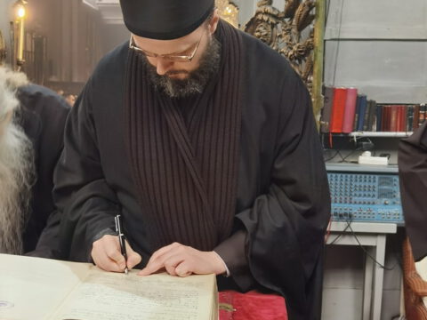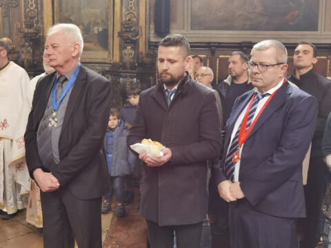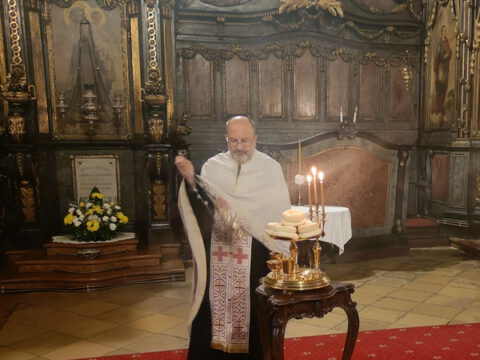 После свете Литургије извршен је чин благосиљања славских дарова, које су принели чланови Културно-уметничког друштва „Вилаˮ, на челу са г. Милорадом Лонићем, уметничким руководиоцем фолклорног ансамбла. Протојереј Бранко Вујиновић, настојатељ Алмашког храма, поздравио је епископе и захвалио им на служењу. Потом се присутнима обратио Преосвећени владика Иринеј, који је сабраном верном народу честитао храмовну славу, а Културно-уметничком друштву „Вилаˮ кумство, пожелевши им много успеха у будућем раду.
