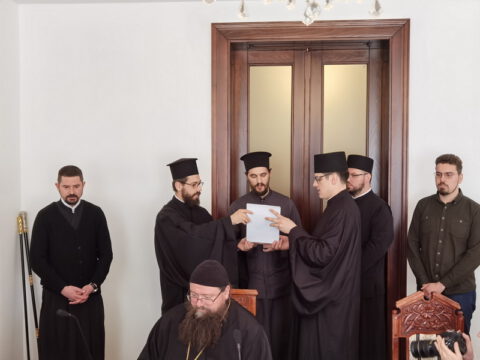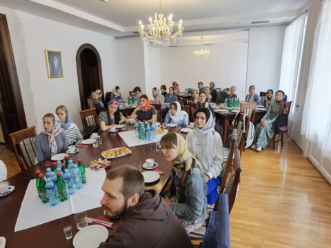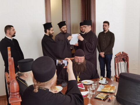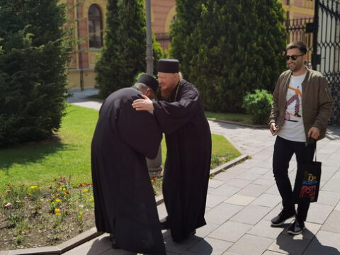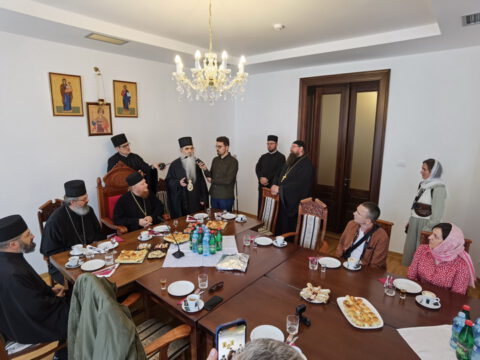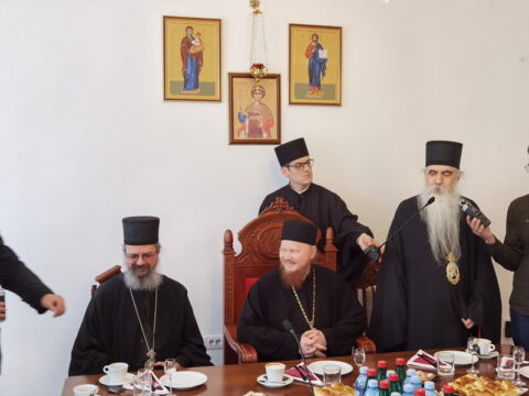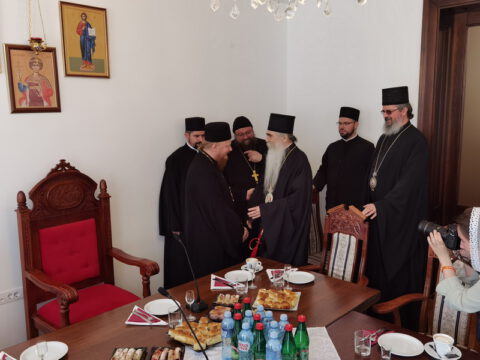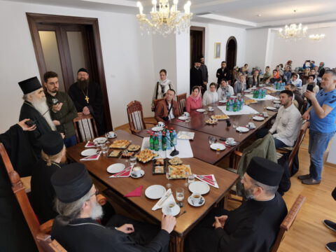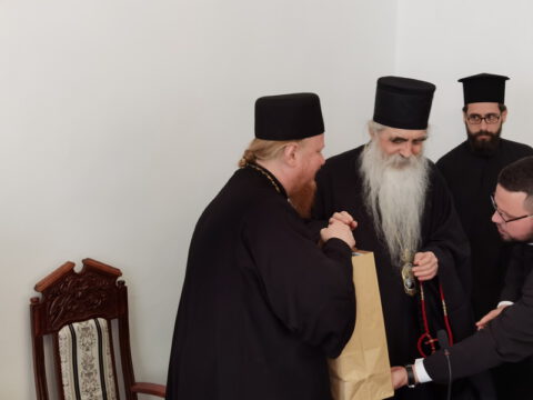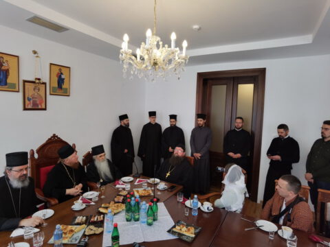 Госте је у дворани Црквене општине новосадске примио Његово Преосвештенство Епископ новосадски и бачки г. Иринеј, у присуству Његовог Преосвештенства Епископа мохачког г. Исихија, протонамесника Ђорђа Стојисављевића, војног свештеника, и новосадских ђакона.