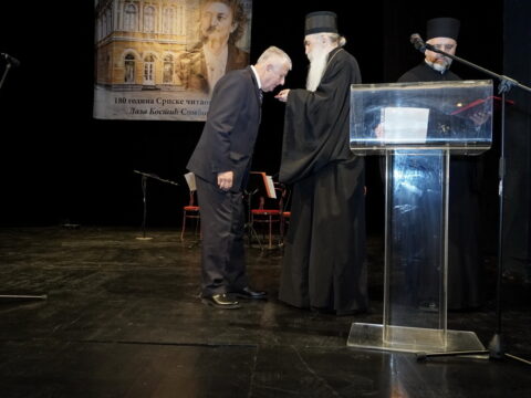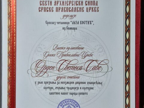 По завршетку обраћања, Високопреосвећени митрополит Иринеј је уручио господину Бориславу Аврамовићу орден Светог Саве другог степена, који је Свети Архијерејски Синод доделио Српској читаоници „Лаза Костићˮ из Сомбора, у знак признања за неизмерни допринос унапређењу културе, очувању традиције и културне баштине нашег народа уопште. Господин Аврамовић је захвалио на високом одликовању и Митрополиту бачком Иринеју уручио захвалницу Српске читаонице.